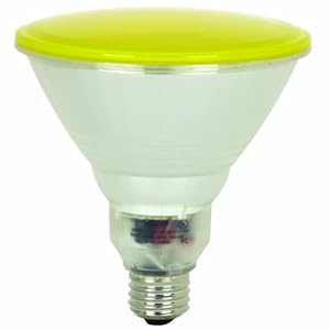 Compact Fluorescent Outdoor PAR38 Reflector, YellowBugs aren't as attracted to this yellow CFL flood light bulb as they are to regular white bulbs, making this a perfect choice for patio or garage areas. Same light output as a 100 watt bulb, but uses only 23 watts of energy. Weather proof, but is not dimmable. PAR38. 23 watt. 8,000 hour average life. Price is for one CFL bulb. One CFL bulb per pack.