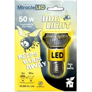 The MiracleLED Bug Light Bulb uses the time-proven bug, deterrent used for decades. The fact these produce hardly any heat keeps even the moths and spiders away. Type R, 120VAC LED Light Bulb. Standard E27, Medium, 50W Replacement Bulb with non standard brightness of simulating a Clear 50W Yellow Incandescent Bulb. The fact that there is essentially no heat generation, there is much less convection for dirt, keeping your fixture cleaner. All the energy savings of any green alternative avoiding all the things you don't like in others - including Mercury. This yellow light has given us tremendous feedback, with instant on, no heat, and without the heavy-metal Mercury, One LED light bulb can outlast 30 incandescent bulbs. LED lights operate at lower temperatures than halogen and incandescent lights. The latest in LED system electronics, thermal management, and mechanical and optical design, making the advantages of LED lighting a practical reality. LED light bulbs will eventually be what we use to replace incandescent bulbs - Compact Fluorescent Lights (CFLs) are a temporary solution to energy-efficient lighting. The reason LEDs have not yet displaced CFLs from the market are twofold: the first generation LED bulbs had a narrow and focused light beam, and the up-front costs of the LED bulbs are higher than incandescent or Compact Fluorescent Lights. The "sticker shock" of the new LEDs remains a deterrent to their widespread acceptance by consumers. However when LED bulbs are compared with CFLs and incandescent for overall efficiency and cost-effectiveness this deterrent should vanish. When considering the number of incandescent and fluorescent bulbs needed for the lifespan of the LED, along with the energy used during that lifespan, your savings will be exponential over your purchase price.Miracle LED Bug Light (50w Equivalent) Keeps bugs away! Yellow outdoor flood lighting keeps bugs away. The Miracle LED Bug Light the latest technological innovation in lighting. It produces the highest lumen output at the lowest wattage! It's sleek design is virtually heat free. The Miracle LED Bug bulb is a yellow flood light that keeps bugs away. It is the latest technological innovation in lighting. It produces the highest lumen output at the lowest wattage. Operates on only 2 watts of power! Features: Nearly zero heat output Equivalent to Standard 50w-65w bulbs Costs 3 cents per 100 hours Lasts 600% longer that standard 50w-65w bulbs 30,000 plus estimated life hours Mercury free